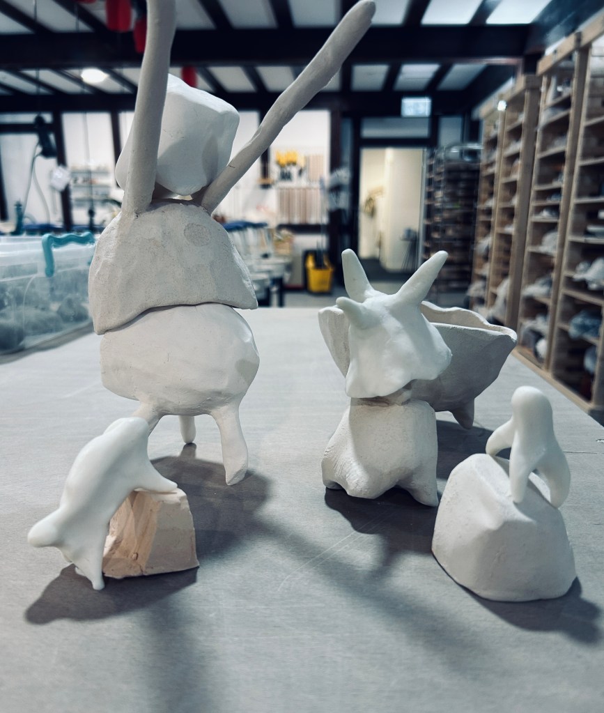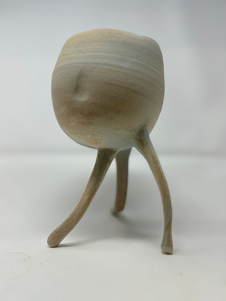 In my case I am drawn to the human experience – being from a physical theatre and story-telling background.  And yet I think I have an aversion to the figure in figurative ceramics – to capturing a human form.  So thus far I have kind of abstracted that by creating three-legged or pot-like figures.  Which look kind of alien – and that also doesn’t satisfy me.  I also often get the feedback that they’re ‘cute’ which makes me feel sad.