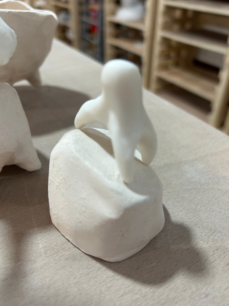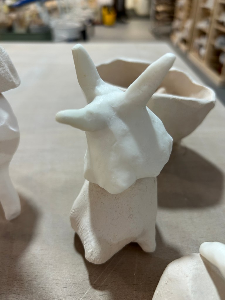 The parian figures that I had to try so hard to get fired – they need a slow ramp to temperature – but can be fired in one glaze fire no bisque.  They’re…just.  I don’t like them.  They feel like tests that I should have finished ages ago.  I think they’re not going to be any part of whatever happens next.