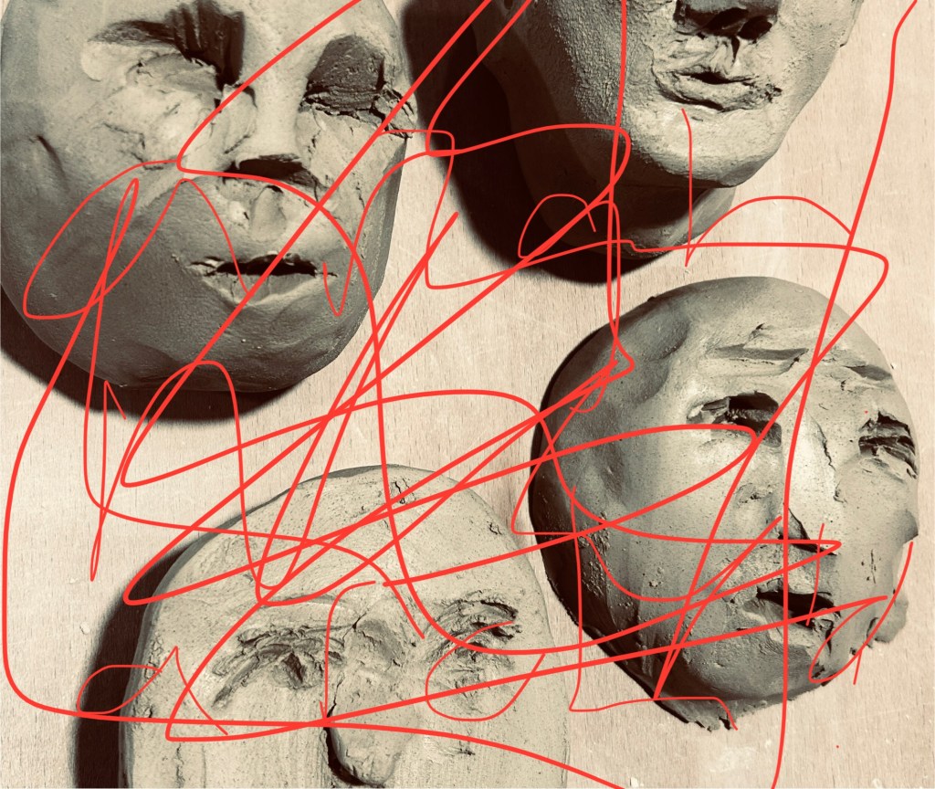 You might think going into the studio and making a real human face isn’t going to kill me.  (I go to life drawing classes, I enjoy figurative paintings…).  But when I walk into my studio and try to make a figurative head I feel kind of sick.  If I’m honest – I feel kind of cheesy.  I tinker away with the human head and I hate it and hide it in a box.  I explore other less realistic, more abstracted faces.  I dislike them all.