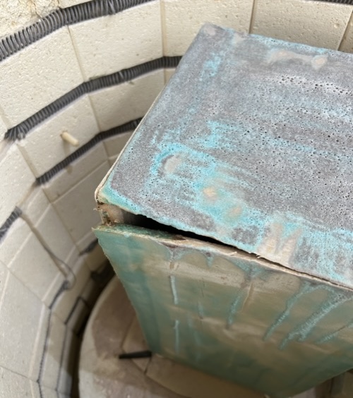 It also has a giant crack across the corner side seam.  Where the box fell and was reassembled during making.  When this sort of thing happens (scaling up slab building, the box was tricky) it’s kind of inevitable that even though you fix the seam beautifully, inside and out, and then you even add a little vinegar slip when it’s drying…the clay remembers like a damaged child.  It all comes out when it’s all grown up.
