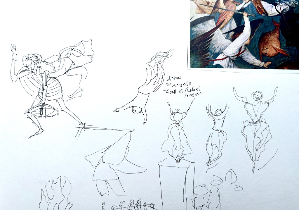 I talk about the journey from making this thing from ideas to what I presented. Now as I write this I’m looking in my sketchbook at drawings of Bruegel’s Mad Meg and the Fall of the Rebel Angels. None of which made it beyond the cutting room floor. Although actually…the idea of falling did. So maybe exploring any visual hunch is good. Blind alleys are maybe more interesting than just sticking to the path.